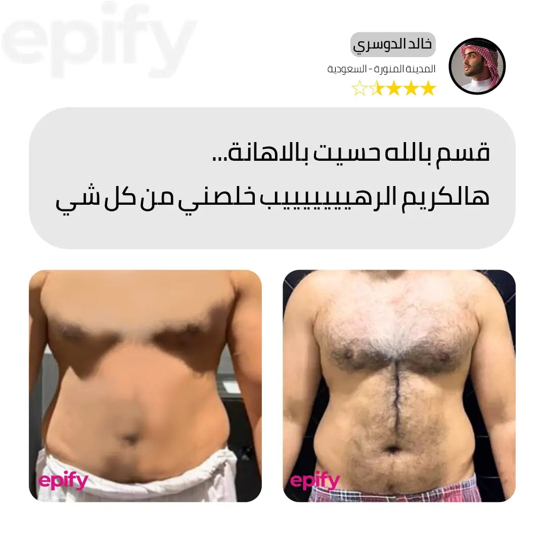 الإيبيفاي مو بس يشيل الشعر، بعد يرطّب البشرة ويغذّيها من الداخل. وبفضل مكوّناته الطبيعية، يمنع التهيّج ويخلّي البشرة ناعمة ومرتوية. يعني إزالة شعر وترطيب وعناية... كله في كريم واحد!
